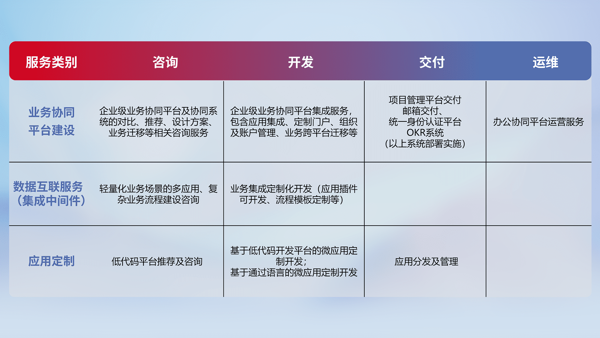针对钉钉、、、企微、、、IDaas等平台级产品提供产品的规划、、方案、、、、交付、、、定制化开发等服务,,,实现如统一协同办公、、智能客户服务、、混合会议管理、、、、智能数据查询、、等业务场景,,实现数字化转型。。。。